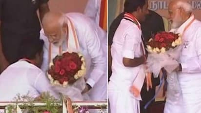 பிரதமர் மோடிக்கு பூங்கொத்து கொடுத்த தேனி மக்களவை தொகுதி வேட்பாளரும், துணை முதலமைச்சர் பன்னீர்செல்வத்தின் மகனுமான ரவீந்திரநாத் குமார், மோடியின் கால்களில் விழுந்து ஆசி பெற்றார். இதனையடுத்து மற்ற வேட்பாளர்களும் அடுத்தடுத்து மோடியின் காலில் விழுந்தனர்.