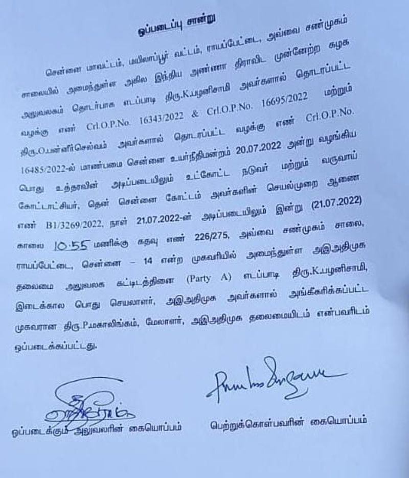 ஒற்றை தலைமை விவகாரத்தில் ஓபிஎஸ்-இபிஎஸ் என அதிமுக இரண்டு குழுக்களாக பிரிந்துள்ளது. இந்தநிலையில் அதிமுக பொதுக்குழு கூட்டம் கடந்த 11 ஆம் தேதி நடைபெற்றது. அதிமுக பொதுக்குழு கூட்டம் நடைபெற்ற நேரத்தில் ஓபிஎஸ் தனது ஆதரவாளர்களோடு வந்து அதிமுக தலைமை அலுவலகத்தை கைப்பற்றினார். அப்போது ஓபிஎஸ்- இபிஎஸ் ஆதரவாளர்கள் இடையே மோதல் ஏற்பட்டது. இந்த சம்பவத்தில் 45க்கும் மேற்பட்டவர்கள் காயம் அடைந்தனர். மேலும் ஏராளமான வாகனங்களும் அடித்து நொறுக்கப்பட்டது. இந்த சம்பவத்தால் ராயப்பேட்டை அவ்வை சண்முகம் சாலையில் 144 தடை உத்தரவு பிறப்பிக்கப்பட்டது. மேலும் வருவாய் கோட்டாட்சியர் அதிமுக தலைமை அலுவலகத்திற்கு சீல் வைத்தார். இந்த சம்பவம் அதிமுக தொண்டர்களை அதிர்ச்சி அடைய வைத்த நிலையில், நீதிமன்றத்தில் வழக்கும் தொடரப்பட்டது.