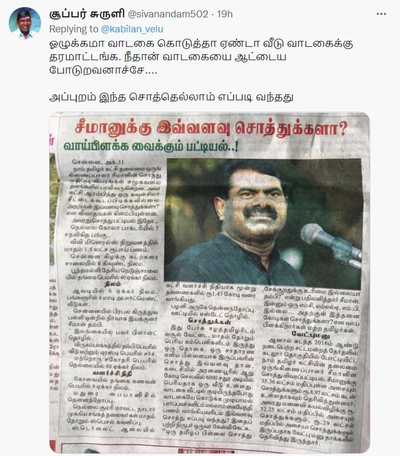 நாளிதழ் ஒன்றில் சீமானின் சொத்து பட்டியலை ஒருவர் வெளியிட்டு, நாம் தமிழர் தம்பிகளை வாயடைக்க வைத்திருக்கிறார். நெல்லை, சென்னை, கோவை, கன்னியாகுமரி ஆகிய பகுதிகளில் சீமானுக்கு இருக்கும் சொத்து விவரங்களை பிரபல நாளிதழ் ஒன்று அப்பட்டமாக வெளியிட்டு இருக்கிறது.