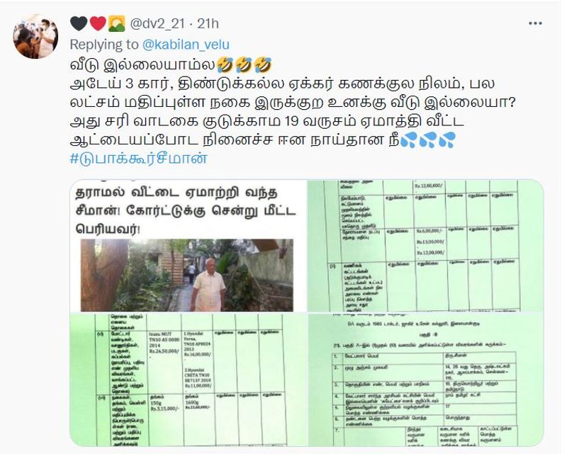 வேறு ஒருவர் நெட்டிசனோ…. திண்டுக்கல்லில் ஏக்கர் கணக்கில் இருக்கும் நிலம், பல லட்சம் ரூபாய் மதிப்புள்ள வீடு உள்ளிட்ட விவரங்களை இந்தா பிடிச்சுக்கோ என்கிற ரேன்ஜூக்கு போட்டு தாக்கி நாதகவை பெண்டெடுத்து உள்ளார்.