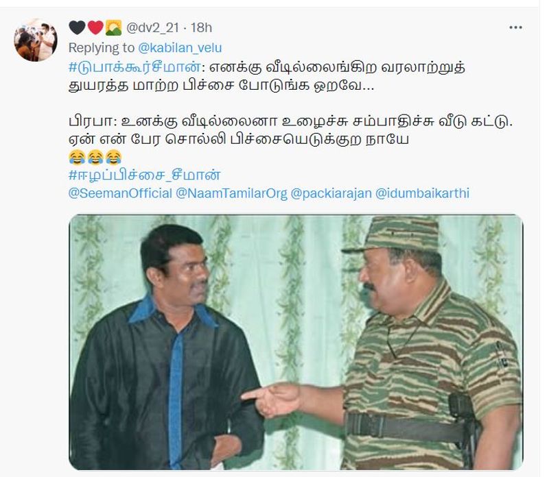 டுபாக்கூர் சீமான் என்று அவரை பார்த்து, விடுதலைப்புலிகள் தலைவர் பிரபாகரன் கண்டிப்பது போலவும் சிலர் போட்டோவுடன் பதிவிட்டு தெறிக்க விட்டு இருக்கின்றனர். இப்படி ஆளாளுக்கு போட்டு தாக்கும் பதிவுகளுக்கு நாம் தமிழர் தம்பிகளும் பதிலடி கொடுத்துக் கொண்டு வருகின்றனர்.