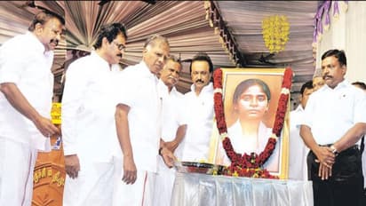 முன்னதாக மேடையில் வைக்கப்பட்டிருந்த மாணவி அனிதாவின் படத்திற்கு ஸ்டாலின் உள்ளிட்ட தலைவர்கள் மலர் தூவி அஞ்சலி செலுத்தினர்.