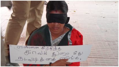 என்னை சீரழித்த காவல் துறை மீது நடவடிக்கை எடுங்க என்ற வாக்கியம் அமைந்தவாறு, மாவட்ட ஆட்சியர் அலுவலகம் முன்பு தனி ஒரு நபராக தர்ணா போராட்டத்தில் ஈடுபட்டு உள்ளார்.