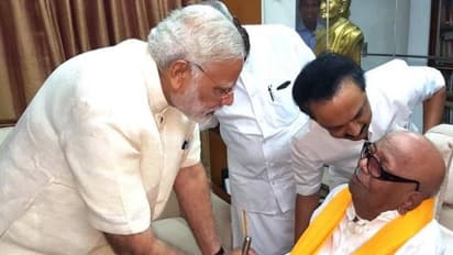 தினத்தந்தி பவளவிழா மற்றும் பிரதமர் அலுவலக இணை செயலாளர் சோமநாதன் இல்லத்திருமண விழா ஆகியவற்றில் கலந்துகொள்வதற்காக சென்னை வந்த பிரதமர் மோடி, திமுக தலைவர் கருணாநிதியை சந்தித்து நலம் விசாரித்தார்.