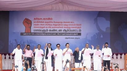 இதில் பங்கேற்றுப் பேசிய மு.க.ஸ்டாலின், அனைத்து கட்சி தலைவர்கள் இங்கு கூடியிருப்பது அரசியலுக்காக இல்லை. 1957-ல் கருணாநிதி சொன்னதை போல உழவனின் கண்ணீரை துடைப்பதற்காக தான். கஜா புயலால் தமிழகம் ஏற்கனவே கண்ணீர் வடித்து கொண்டு இருக்கிறது. இந்நிலையில் மேகதாதுவில் அணை கட்ட போகும் செய்தி தமிழகத்தை கொந்தளிக்க வைத்திருக்கிறது என ஆவேசமாக தெரிவித்தார்.