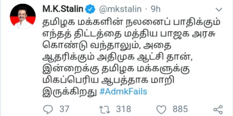 தமிழக மக்களின் நலனைப் பாதிக்கும் எந்தத் திட்டத்தை மத்திய பா.ஜ.க. அரசு கொண்டு வந்தாலும், அதை ஆதரிக்கும் அ.தி.மு.க ஆட்சி தான், இன்றைக்கு தமிழக மக்களுக்கு மிகப்பெரிய ஆபத்தாக மாறி இருக்கிறது என ஸ்டாலின் தனது கண்டனத்தைப் பதிவு செய்துள்ளார்.