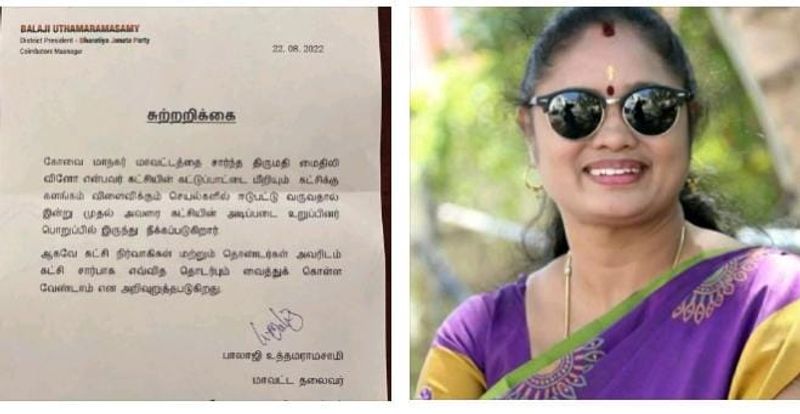 பொள்ளாட்சியில் நடைபெறும் திமுக பொதுக்கூட்டத்தில், மாற்று கட்சியை சேர்ந்த ஏராளமானோர் இணையும் நிலையில் கோவை மண்டலத்தை சேர்ந்த அதிமுக மற்றும் பாஜக பிரமுகர்கள் இணையவுள்ளதாக கூறப்படுகிறது. கடந்த சில வாரங்களாக அமைச்சர் செந்தில் பாலாஜி மாற்று கட்சி நிர்வாகிகளோடு ஆலோசனை மேற்கொண்டதாக தகவல் வெளியானது. இந்தநிலையில் கோவை பகுதியை சேர்ந்த பாஜக முக்கிய நிர்வாகி மைதிலி வினோ திமுகவில் இணைய இருப்பதாக தற்போது தகவல் வெளியானது. இதனையடுத்து கோவை மாவட்ட பாஜக தலைவர் பாலாஜி வெளியிட்டுள்ள அறிக்கையில், கட்சி கட்டுப்பாட்டை மீறி செயல்பட்ட காரணத்தால் பாஜகவில் இருந்து மைதிலி வினோ நீக்கப்பட்டுள்ளதாக தெரிவிக்கப்ட்டுள்ளது.