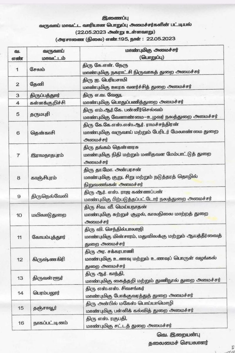இதே போல சேலத்திற்கு கேஎன் நேரு, தேனிக்கு ஐ.பெரியசாமி, திருப்பத்தூர் மற்றும் கள்ளக்குறிச்சிக்கு எ.வ வேலு, தருமபுரிக்கு எம்ஏர்கே.பன்னீர் செல்வம், தென்காசிக்கு கேஎஸ்எஸ்ஆர் ராமசந்திரன், ராமநாதபுரம் தங்கம் தென்னரசு, காஞ்சிபுரம் தா.மோ அன்பரசன், திருநெல்வேலி ராஜ கண்ணப்பன், கோவைக்கு செந்தில் பாலாஜி, பெரம்பலூர் சிவசங்கர், தஞ்சாவூர் அன்பில் மகேஷ், உள்ளிட்ட அமைச்சர்கள் பொறுப்பு அமைச்சராக நியமிக்கப்பட்டுள்ளனர்.