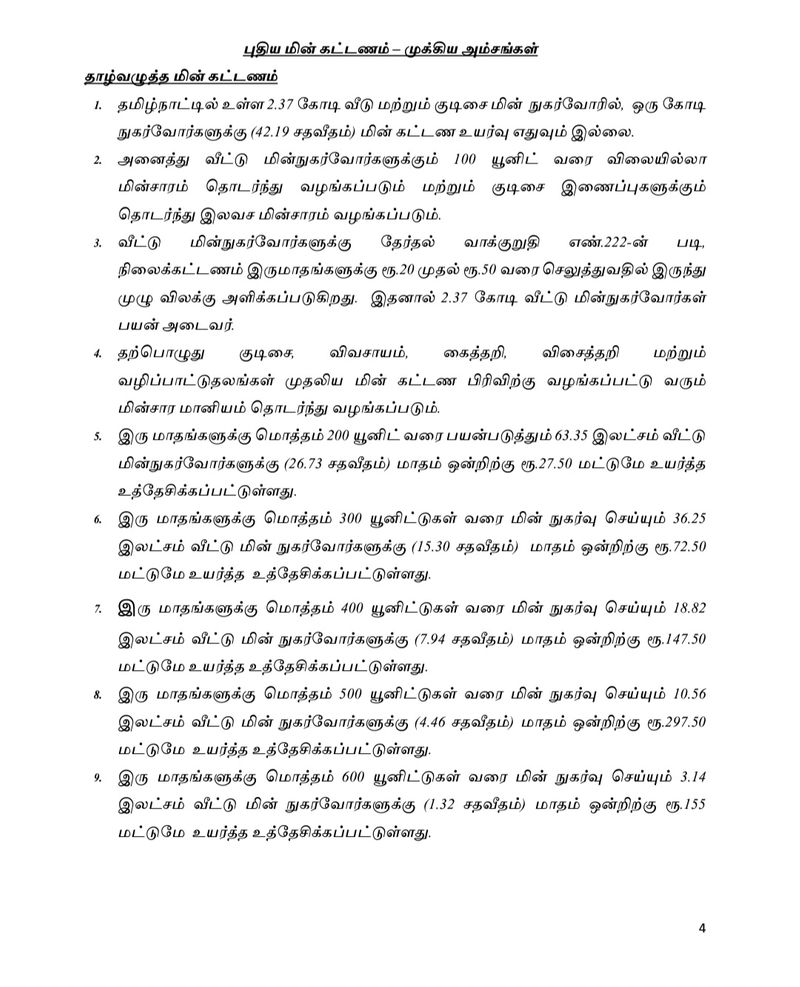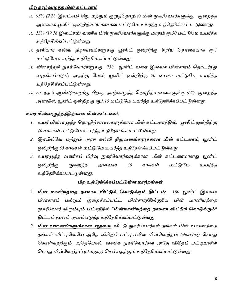 42% வீடுகளுக்கான மின் கட்டணத்தில் எந்த மாற்றமும் இருக்காது. முதல் 100 யூனிட் வீட்டு இலவச மின்சாரம் தேவையில்லை எனில், அந்த மானியத்தை வாடிக்கையாளர்கள் விட்டுக்கொடுக்கலாம். இருந்தாலும், 100 யூனிட் மின் விநியோகத்தில் எந்த மாற்றமும் இல்லை. விசைத்தறிகளுக்கு 750 யூனிட் மின்சாரம் இலவசம் தொடர்ந்து அமல்படுத்தப்படும்.