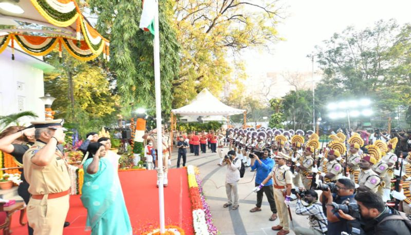74-வது குடியரசு தினம் நாடு முழுவதும் சிறப்பாக கொண்டாடப்பட்டு வருகிறது. மத்திய, மாநில அரசுகள் பல்வேறு நிகழ்ச்சிகளுக்கு ஏற்பாடு செய்திருக்கின்றன. மாநிலங்களில் குடியரசு தின விழாவில் ஆளுநர்களும், சுதந்திர தின விழாவில் முதல்வரும் கொடியேற்றுவது வழக்கம். இந்நிலையில் தெலங்கானா தலைநகர் ஐதராபாத்தில் உள்ள ஆளுநர் மாளிகையில், குடியரசு தின விழா கொண்டாட்டத்திற்கு ஏற்பாடு செய்யப்பட்டது. மாநில ஆளுநர் தமிழிசை சவுந்தரராஜன் தேசியக்கொடி ஏற்றி வைத்து மரியாதை செலுத்தினார்.