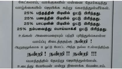 காஞ்சிபுரம் மாவட்டம் பென்னலூர் ஊராட்சியில் 9-ஆவது வார்டு தேர்தலில் போட்டியிட்ட ஓ.முத்து என்பவர் 6 ஓட்டுகள் மட்டுமே பெற்று படுதோல்வியடைந்தார். வழக்கமாக தேர்தலில் வெற்றி பெற்றவர்கள் வாக்காளர்களுக்கு நன்றி அறிவிப்பு செய்து போஸ்டர்கள் ஒட்டுவார்கள். ஆனால், தேர்தலில் படுதோல்வியடைந்த வேட்பாளர் ஒ.முத்து நன்றி தெரிவித்து துண்டு பிரசுரம் வெளியிட்டுள்ளார். அதில் அவர் தெரிவித்துள்ள பாயிண்டுகள்தான் சுவாரசியமானவை.