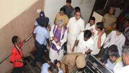 பின்னர், முதல் தளம் இறங்கி செல்ல முயன்ற போது, படிக்கட்டின் கீழ் அமைந்துள்ள கதவு பூட்டப்பட்டிருந்தது. பூட்டை திறப்பதற்காக மருத்துவர்களும் ஊழியர்களும் முயன்றனர். ஆனால், பூட்டை திறக்க முடியவில்லை என்று கூறப்படுகிறது. இதனால் விஜயபாஸ்கர், ராதாகிருஷ்ணன் மற்றும் மருத்துவர்கள் தர்ம சங்கடத்துக்கு ஆளானார்கள்.