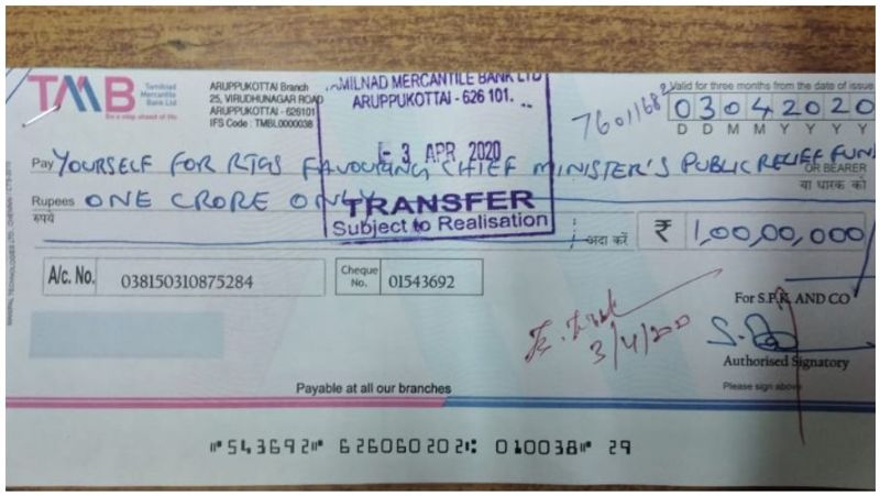 இதனையடுத்து டி.வி.எஸ். மோட்டார்ஸ், சக்தி மசாலா உள்ளிட்ட நிறுவனங்கள் தமிழக அரசுக்கு நிதி வழங்கி வருகின்றன. இந்நிலையில், ’’தமிழக நெடுஞ்சாலை பணிகளை செய்யும் ஒப்பந்த நிறுவனம் எஸ்.பி.கே அண்ட் கோ நிறுவனத்தின் உரிமையாளர் செய்யாத்துறை முதல்வர் நிவாரண நிதிக்காக ஒரு கோடி ரூபாயை வழங்கியுள்ளார். இதுவரை முதல்வர் நிவாரண நிதியாக ரூ.40 கோடி வரை வந்து சேர்ந்துள்ளதாக கூறப்படுகிறது.