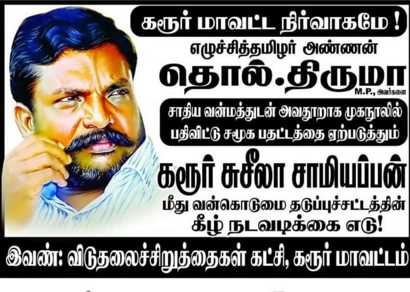 விடுதலை சிறுத்தைகள் கட்சி கரூர் மாவட்ட செயலாளர் ஜெயராமன், கரூர் மாவட்ட எஸ்பி.யிடம் , அதிமுகவை சேர்ந்த சுசீலா சாமியப்பன் என்பவர் மீது திருமாவளவனை பற்றி அரசியல் காழ்ப்புணர்ச்சி காரணமாகவும், சாதிய வன்மத்தின் காரணமாகவும், ஒருமையில் பேசி, தாழ்த்தப்பட்ட சமூகத்தை இழிவுபடுத்தும் நோக்கத்துடனும் முகநூல் பக்கத்தில் பதிவிட்ட்டுள்ளதாகவும் அவர் மீது நடவடிக்கை எடுக்க வேண்டும் எனவும் புகார் அளித்து இருந்தார்.