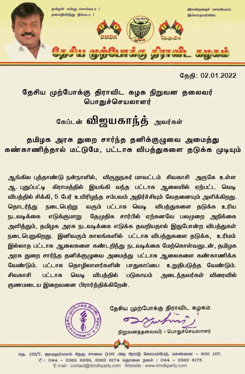 விருதுநகர் மாவட்டம் சிவகாசி அருகே எம்.புதுப்பட்டி அடுத்துள்ள மேட்டுப்பட்டி கிராமத்தில் முருகன் என்பவருக்கு சொந்தமான பட்டாசு ஆலை செயல்பட்டு வருகிறது. புத்தாண்டு தினமான நேற்று பட்டாசு ஆலையில் வழக்கம்போல் தொழிலாளர்கள் பணியில் ஈடுபட்டிருந்தனர். அப்போது, திடீரென வெடி விபத்து ஏற்பட்டது. இதில், 5 பேர் உயிரிழந்தனர். 10 பேர் காயங்களுடன் மருத்துவமனையில் சிகிச்சை பெற்று வருகிறார். இந்நிலையில், தமிழக அரசு, துறை சார்ந்த தனிக்குழுவை அமைத்து கண்காணித்தால் மட்டுமே பட்டாசு விபத்துகளை தடுக்க முடியும் என விஜயகாந்த் தெரிவித்துள்ளார்.