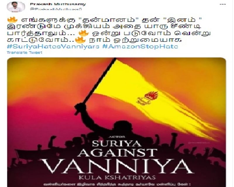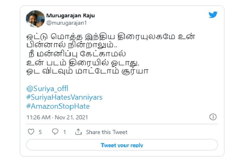 இந்நிலையில் அதற்கு பதிலடி கொடுக்கும் விதமாகவும், நடிகர் சூர்யாவை பணிய வைக்க வேண்டும் என்பதற்காகவும் பாமக மற்றும் வன்னியர் சங்கத்தை சேர்ந்தவர்கள் #SuriyaHatesVanniyars மற்றும் #AmazonStopHate என்ற ஹேஷ்டேக்குகளில் தங்களுடைய கருத்துக்களை தெரிவித்து தேசிய டிரென்ட் செய்து வருகின்றனர். ஏற்கனவே நீதிமன்றத்தில் வழக்கு தொடரப்பட்டுள்ள நிலையில் இந்த விவகாரம் தேசிய அளவில் எடுத்து செல்லப்பட்டுள்ளதால் மற்ற மாநிலத்தில் வாழும் அதே சமூகத்தை சேர்ந்தவர்களும் இதற்கு ஆதரவாக கருத்து தெரிவிக்க ஆரம்பித்துள்ளனர். இதனால் ஜெய் பீம் பட விவகாரம் தேசிய அளவிலான பிரச்சனையாக உருவெடுத்துள்ளது.