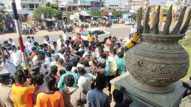 திருவண்ணாமலை அடுத்த நாயுடுமங்கலம் கூட்ரோட்டில், 1989ம் ஆண்டு பாமக நிறுவனர் ராமதாஸ் தலைமையில் அக்னி கலசம் சிலை திறந்து வைத்து கொடியேற்றப்பட்டது. சாலை விரிவாக்க பணிக்காக தற்காலிகமாக அகற்றப்பட்ட வன்னியர் சங்கத்தின் அக்னி கலசம் பின்னர் புதிதாக கட்டப்பட்ட பேருந்து நிறுத்தம் அருகே மீண்டும் நிறுவப்பட்டது. இதற்கு எதிர்ப்பு தெரிவித்த விடுதலை சிறுத்தை கட்சியினர் திருவண்ணாமலை மாவட்ட ஆட்சியரிடம் புகார் அளித்துள்ளனர். இதனால், சட்டம் ஒழுங்கு பிரச்சனை வர வாய்ப்புள்ளதால் வன்னியர் சங்க அக்னி கலசத்தை அகற்ற மாவட்ட ஆட்சியர் உத்தரவு பிறப்பித்தார். இதனையடுத்து, போலீஸ் பாதுகாப்புடன் அக்னி கலசத்தை அகற்றினர். இதற்கு கண்டனம் தெரிவித்து பட்டாளி மக்கள் கட்சி மற்றும் வன்னியர்கள் போராட்டத்தில் ஈடுபட்டனர். இதனால், அங்கு பரபரப்பு ஏற்பட்டது.