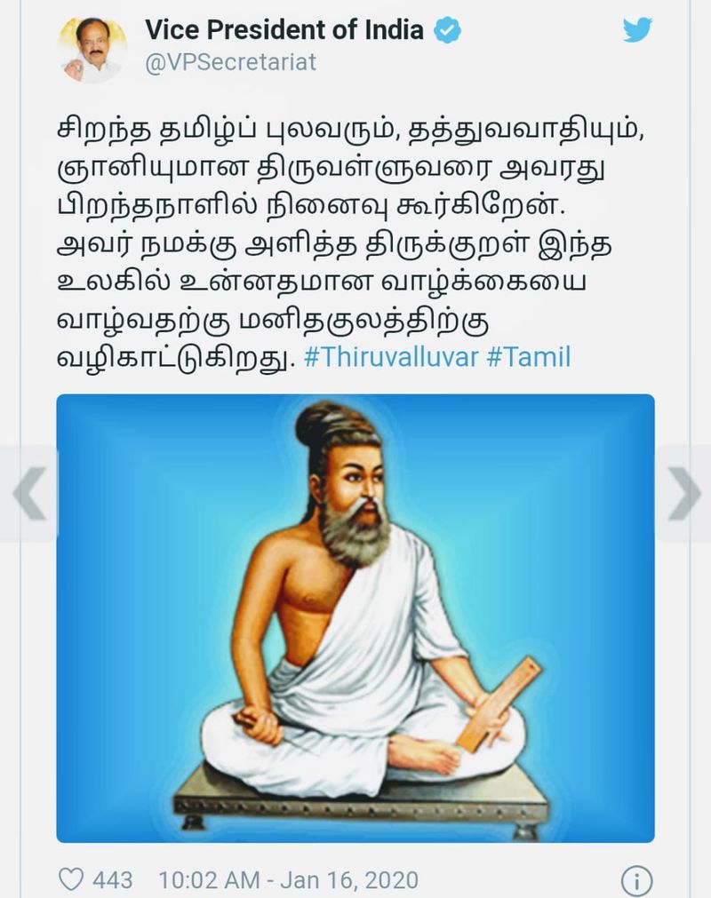 திருவள்ளுவர் தினத்தை முன்னிட்டு காவி உடையில் , கழுத்தில் ருத்ராட்ச மாலை , நெற்றியில் திருநீற்றுப் பட்டை என உள்ள திருவள்ளுவர் படத்தை துணை ஜனாதிபதி வெங்கையா நாயுடு ட்விட்டர் பக்கத்தில் பகிர்ந்து திருவள்ளுவர் தின வாழ்த்து கூறியிருப்பது சர்ச்சையை ஏற்படுத்தியுள்ளது . தமிழ்ப்புலவர் , தெய்வப்புலவர் , திருவள்ளுவரை பாஜகவினர் இந்து மத அடையாளங்களை புகுத்தி அவரை இந்துவாக சித்தரிக்க முயற்சிக்கும் நடவடிக்கையில் இறங்கியுள்ளனர் . இது தமிழகத்தில் மிகப் பெரிய அதிர்ச்சியை ஏற்படுத்தியுள்ளது . பாஜகவின் இம்முயற்சிக்கு எதிர்ப்பு தெரிவித்து எதிர்க்கட்சிகள் கண்டனம் தெரிவித்து வருகின்றன.