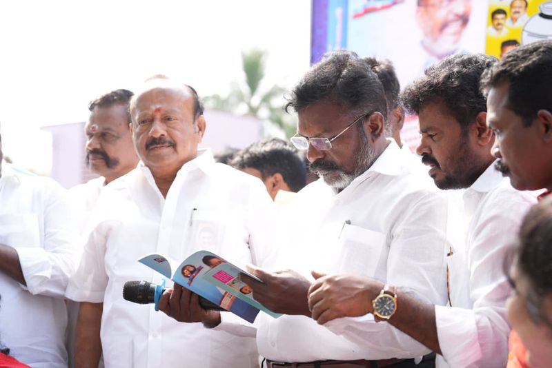 இதனை தொடர்ந்து விடுதலை சிறுத்தைகள் தேர்தல் அறிக்கையை திருமாவளவன் வெளியிட்டார். அதனை அமைச்சர் எம்ஆர்கே பன்னீர் செல்வம் பெற்றுக்கொண்டார்.