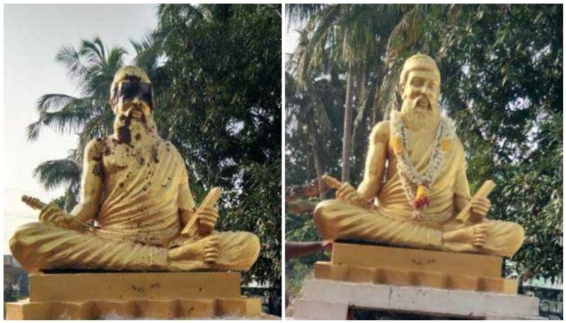 தமிழக பாஜக தனது ட்விட்டர் பக்கத்தில் திருவள்ளுவருக்கு காவி உடை, விபூதி பட்டை, ருத்ராட்சை கொட்டை ஆகியவற்றைக் கொண்டு உருவாக்கப்பட்ட திருவள்ளுவரை வெளியிட்டது. இது பெரும் சர்ச்சையாக வெடித்தது. பாஜகவுக்கு எதிராக திமுக கூட்டணி கட்சிகள் திரண்டன. இதற்கிடையே பிள்ளையார்பட்டியில் மர்ம ஆசாமிகளால் திருவள்ளுவர் சிலை சேதப்படுத்தப்பட்டது. ஏற்கனவே இருந்த பிரச்னையோடு இதுவும் சேர்ந்துகொண்டதால், திருவள்ளுவர் சர்ச்சை ஓயவில்லை. இந்தச் செயலுக்கு அரசியல் கட்சி தலைவர்கள் கடும் கண்டனத்தை தெரிவித்தனர்.