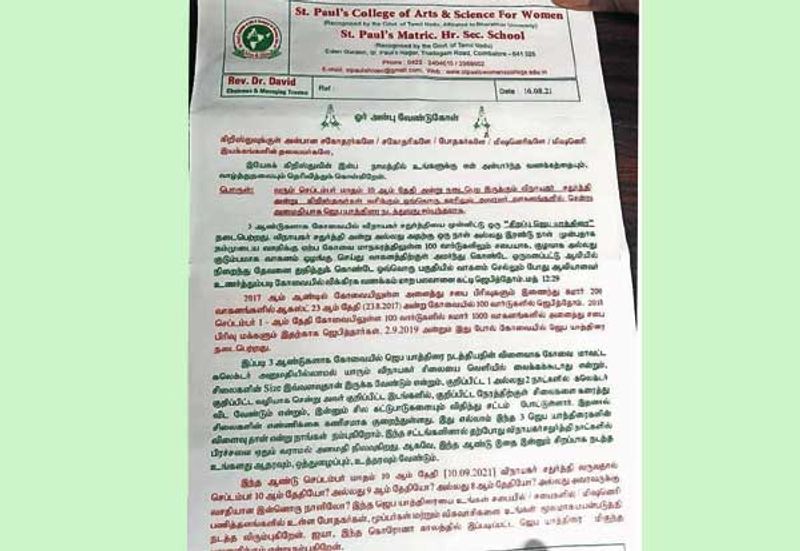கொரோனா பாதிப்பால் இந்த ஆண்டு பொது இடங்களில் விநாயகர் சிலைகளை வைத்து வணங்குவதற்கு தமிழக அரசு தடை விதித்து உள்ளது. ஆனால், இந்த தடை அறிவிக்கப்படுவதற்கு முன்பு கடந்த ஆகஸ்ட்16ம் தேதி , கிறிஸ்துவர்களுக்கு கோவை, செயின்ட் பால் கல்லுாரி தலைவர் டேவிட் கடிதம் அனுப்பி உள்ளார். அவை, கல்லூரி பெயருடன் பிட் நோட்டீஸ்களாக விநியோகிக்கப்பட்டு வருகின்றன.