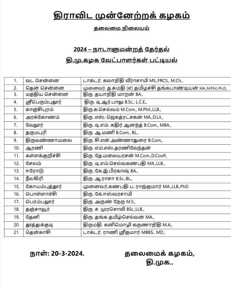 10,தர்மபுரி- ஆ.மணி 11,ஆரணி-தரணிவேந்தன் 12,வேலூர்- கதிர் ஆனந்த், 13,கள்ளக்குறிச்சி- மலையரசன், 14,சேலம்-செல்வகணபதி, 15,கோயம்புத்தூர் - கணபதி ராஜ்குமார். 16,பெரம்பலூர் - அருண் நேரு 17,நீலகிரி - ஆ.ராசா, 18,பொள்ளாச்சி- ஈஸ்வரசாமி, 19,தஞ்சாவூர் - முரசொலி 20,ஈரோடு-பிரகாஷ் 21,தேனி- தங்க தமிழ்செல்வன் ஆகியோரின் பெயர்கள் இடம்பெற்றுள்ளது.