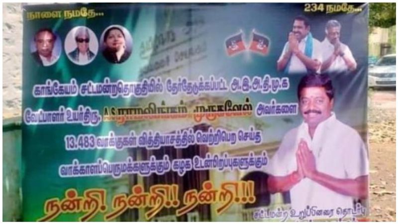 காங்கயம் சட்டப்பேரவைத் தொகுதியில் அதிமுக வேட்பாளராகப் போட்டியிட்டவர் ஏ.எஸ்.ராமலிங்கம். இவர் வெற்றி பெற்றதாக, பழையகோட்டை அதிமுக சார்பில் பதாகை வைக்கப்பட்டுள்ளது. அதில், ’காங்கயம் சட்டப்பேரவைத் தொகுதியில், தேர்ந்தெடுக்கப்பட்ட அதிமுக வேட்பாளர் ஏ.எஸ்.ராமலிங்கத்தை 13,483 வாக்குகள் வித்தியாசத்தில் வெற்றி பெறவைத்த வாக்காளப் பெருமக்களுக்கும், கழக உடன்பிறப்புகளுக்கும் நன்றி, நன்றி. நன்றி’ என அதில் குறிப்பிடப்பட்டுள்ளது.