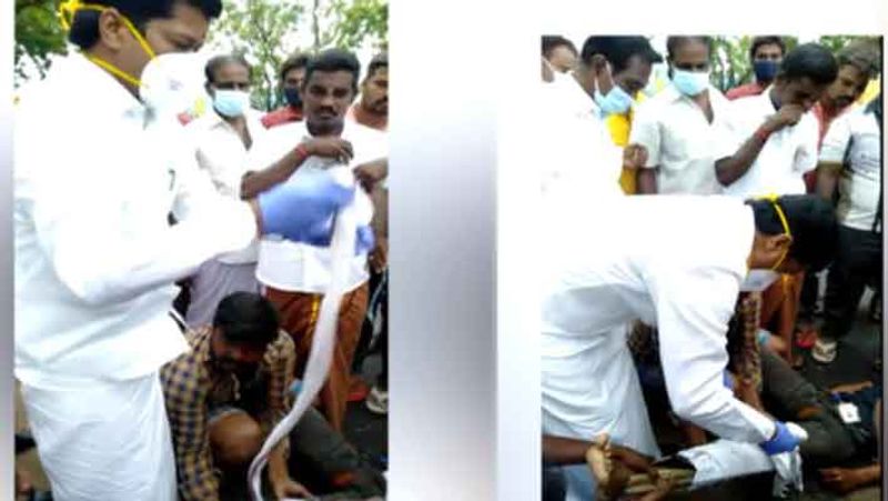 விழுப்புரத்தில் சாலை விபத்தில் சிக்கி கால் முறிந்து வலியால் துடித்த இளைஞருக்கு மருத்துவரான டாக்டரும் திமுக எம்எல்ஏ லட்சுமணன், கட்சி கரை வேட்டியைக் கிழித்துக் கட்டுப்போட்டு முதலுதவி அளித்த வீடியோ வைரலாகி வருகிறது.