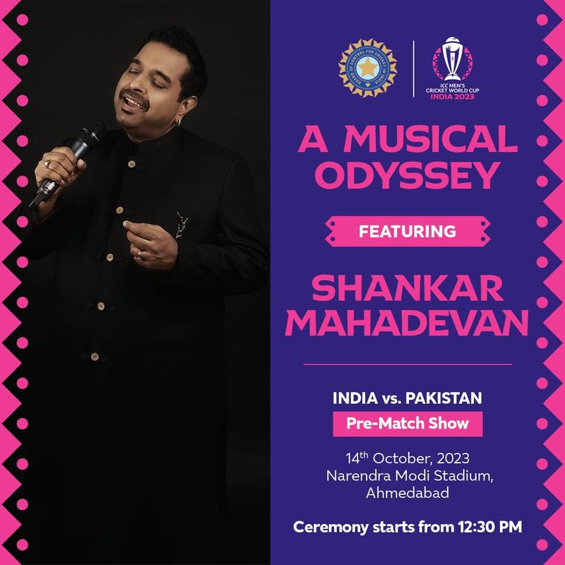இதில், பின்னணி பாடகர் சங்கர் மகாதேவன், அரிஜித் சிங், சுக்விந்தர் சிங் ஆகியோரது இசை நிகழ்ச்சிகள் நடத்தப்பட இருக்கிறது. இந்தியா மற்றும் பாகிஸ்தான் அணிகளுக்கு இடையிலான போட்டியானது பிற்பகல் 2 மணிக்கு தொடங்கும் நிலையில், இந்த இசை நிகழ்ச்சியானது பிற்பகல் 12.30 மணிக்கு நடக்க இருப்பதாக அறிவிக்கப்பட்டுள்ளது. கிட்டத்தட்ட 1.30 மணி வரையில் இந்த இசை நிகழ்ச்சிகள் நடத்தப்படும் என்று எதிர்பார்க்கப்படுகிறது. மேலும், இன்னிங்ஸ் பிரேக்கின் போது 10 நிமிட நிகழ்ச்சிக்கும் ஏற்பாடு செய்யப்பட்டுள்ளதாக தகவல் தெரிவிக்கின்றது.