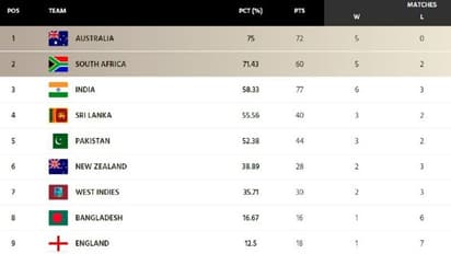 75 சதவிகித வெற்றியுடன் ஆஸ்திரேலிய அணி முதலிடத்தில் உள்ளது. 71.43 என்ற வெற்றி சதவிகிதத்துடன் தென்னாப்பிரிக்க அணி புள்ளி பட்டியலில் இரண்டாமிடத்தில் உள்ளது. 58.33 வெற்றி சதவிகிதத்துடன் இந்திய அணி 3ம் இடத்தில் உள்ளது.