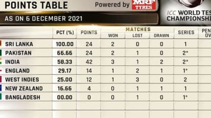 நியூசிலாந்துக்கு எதிரான டெஸ்ட் தொடரின் முதல் போட்டி டிராவானாலும், 2வது டெஸ்ட்டில் 372 ரன்கள் வித்தியாசத்தில் அபார வெற்றி பெற்ற இந்திய அணி, 3ம் இடத்தில் உள்ளது. நியூசிலாந்துக்கு எதிரான டெஸ்ட் தொடரை இந்திய அணி வென்றிருந்தாலும், 58.33 வெற்றி சதவிகிதத்துடன் இந்திய அணி தொடர்ந்து 3ம் இடத்தில் நீடிக்கிறது. எனவே இந்தியா - நியூசிலாந்து இடையேயான டெஸ்ட் தொடர் புள்ளி பட்டியலில் எந்த தாக்கத்தையும் ஏற்படுத்தவில்லை.
