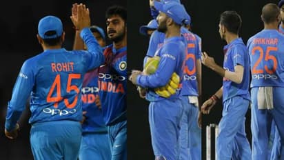 ரோஹித் சர்மா(கேப்டன்), ஷிகர் தவான், ரிஷப் பண்ட், விஜய் சங்கர், தோனி(விக்கெட் கீப்பர்), தினேஷ் கார்த்திக், ஹர்திக் பாண்டியா, குருணல் பாண்டியா, புவனேஷ்வர் குமார், கலீல் அகமது, சாஹல்.