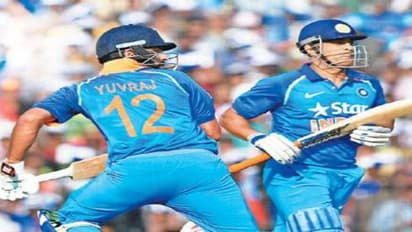 அடுத்து வந்த கேப்டன் கோலி 8 ஓட்டங்கள் எடுத்து பெவிலியன் திரும்ப, தொடக்கத்திலேயே திணறியது இந்தியா. அடுத்து ஜோடி சேர்ந்த தோனி - யுவராஜ், விக்கெட் சரிவுக்கு அணைபோட்டு அபாரமாக ஆடி அணியின் ஸ்கோரை உயர்த்தினர். இந்த ஜோடி 4-ஆவது விக்கெட்டுக்கு 250 ஓட்டங்கள் குவித்தது.