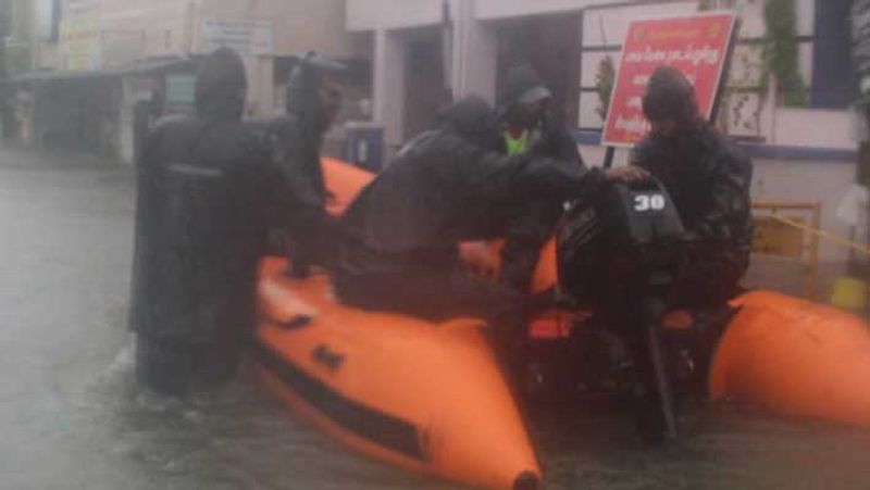 இந்நிலையில், சென்னை மட்டுமல்லாமல் புறநகர் பகுதிகளான தாம்பரம், பெருங்களத்தூர், முடிச்சூர் உள்ளிட்ட பகுதிகளில் விடிய விடிய பெய்து வரும் கன மழையின் காரணமாக வெள்ள நீர் குடியிருப்புகளை சூழ்ந்துள்ளது. தாழ்வான பகுதிகளில் இடுப்பளவு வரை மழை நீர் தேங்கியுள்ளது. இதனால் பொது மக்களின் இயல்பு வாழ்க்கை முற்றிலுமாக பாதிக்கப்பட்டது. வீடுகளுக்குள் வெள்ளநீரில் சிக்கி வெளியேற முடியாமல் தவிப்பவர்களை படகுகள் மூலமும் ரப்பர் மிதவைகள் மூலமும் பேரிடர் மீட்புப் படையினர் மீட்டு வருகின்றனர். ஏராளமானோர் முகாம்களில் தங்கவைக்கப்பட்டுள்ளனர். அவர்கள் அனைவருக்கும் உணவு, மருந்து மாத்திரைகள் அளிக்கப்பட்டு வருகின்றன.