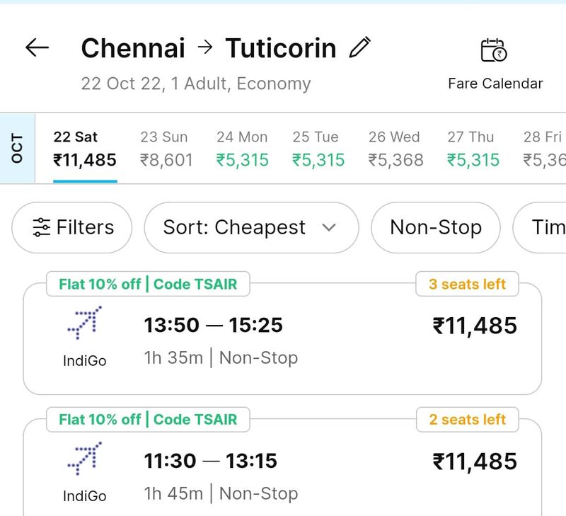 இதேபோல், தமிழ்நாட்டுக்குள் இயக்கப்படும் விமானங்களான சென்னை - மதுரை இடையிலான வழக்கமான கட்டணம் ரூ.4,200. தற்போது ரூ.12,000 ஆகவும், சென்னை திருச்சி வழக்கமான கட்டணம் ரூ. 3,500, இது தற்போது ரூ.11,500 ஆகவும், சென்னை, தூத்துக்குடி இடையிலான வழக்கமான கட்டணம் ரூ.4,500, ஆனால், இது தற்போது ரூ.9,500 - ரூ.11,500 வரையும், சென்னை, கோவை வழக்கமான கட்டணம் ரூ. 3,500, ஆனால், இது தற்போது ரூ.11,500 ஆகவும் உயர்த்தப்பட்டுள்ளது.