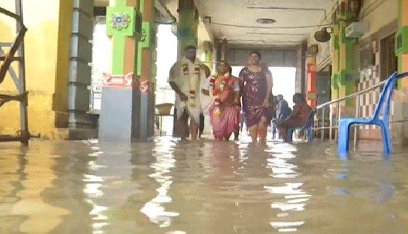 சென்னை புளியந்தோப்பில் உள்ள ஆஞ்சிநேயர் கோவிலில் இன்று நடக்க இருந்த ஐந்து திருமணங்கள் மழை காரணமாக தாமதம் ஆனதோடு கோயிலில் தேங்கிய மழை நீரால் தம்பதிகள் முழுவதும் நனைந்தனர். வடகிழக்கு பருவமழை தொடங்கியதை அடுத்து தமிழகத்தின் பல்வேறு பகுதிகளில் கனமழை பெய்து வருகிறது. குறிப்பாக சென்னையில் பெய்த கனமழையால் பொதுமக்கள் பல்வேறு வகையில் பாதிக்கப்பட்டுள்ளனர்.