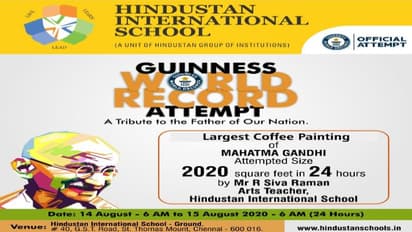 ஹிந்துஸ்தான் சர்வதேச பள்ளியின் கலை ஆசிரியர் ஆர்.சிவராமன் ஆகஸ்ட் 14 காலை 6 முதல் ஆகஸ்ட் 15 காலை 6 மணி வரையிலான 24 மணி நேரத்தில் தேசப்பிதா மகாத்மா காந்தி ஓவியத்தை 2020 சதுர அடியில் வரைந்து கின்னஸ் சாதனைக்கு முயற்சிக்கிறார்.