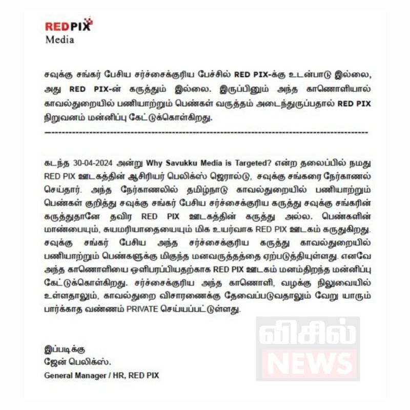 ரெட்பிக்ஸ் மீடியா (REDPIX Media) வெளியிட்டுள்ள அறிக்கையில், “சவுக்கு சங்கர் பேசிய சர்ச்சைக்குரிய பேச்சில் RED PIX-க்கு உடன்பாடு இல்லை, அது RED PIX-ன் கருத்தும் இல்லை. இருப்பினும் அந்த காணொளியால் காவல்துறையில் பணியாற்றும் பெண்கள் வருத்தம் அடைந்துருப்பதால் RED PIX நிறுவனம் மன்னிப்பு கேட்டுக்கொள்கிறது.
