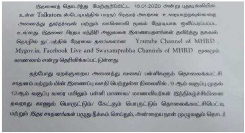 இந்த நிகழ்ச்சியை நாடு முழுவதும் உள்ள மாணவர்கள் கண்டுகளிக்க ஏற்பாடு செய்யும்படி மாநில அரசுகளுக்கு மத்திய அரசு அறிவுறுத்தியுள்ளது. இந்நிலையில் தமிழகத்தில் அனைத்து பள்ளிகளிலும் 9-ம் வகுப்பு முதல் 12-ம் வகுப்பு வரை உள்ள மாணவர்கள் இந்த நிகழ்ச்சியைப் பார்ப்பதற்கான வசதிகளை மேற்கொள்ளும்படி பள்ளிக் கல்வித் துறை, அதிகாரிகளுக்கு உத்தரவிட்டுள்ளது. இந்த உத்தரவால், தமிழகத்தில் ஜனவரி 14 முதல் 19 வரை பள்ளிகள் பொங்கல் பண்டிகைக்காக மூடப்பட்டிருக்கும் பள்ளிகள் ஜனவரி 16 அன்று திறக்கப்படுமா என்ற கேள்வியும் குழப்பமும் ஏற்பட்டுள்ளது.