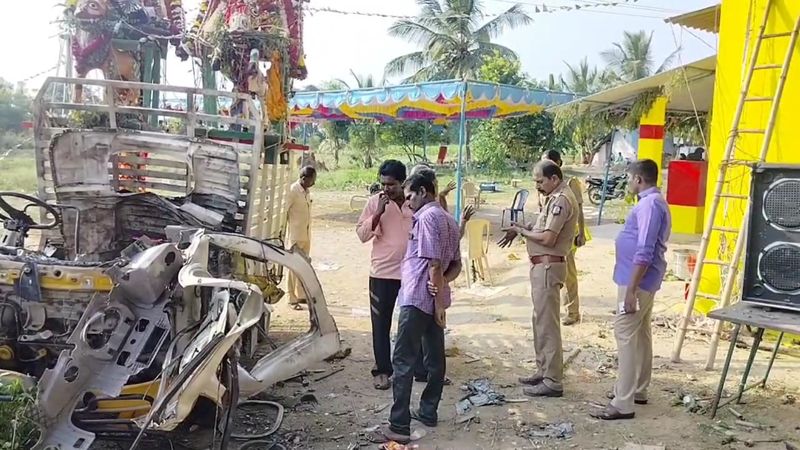 மினி லாரியை அதே பகுதியைச் சேர்ந்த ஓட்டுநர் ராகவேந்திரன் (வயது 26) என்பவர் ஓட்டி சென்றார். வீதி உலாவில் வான வேடிக்கைகள் நிகழ்த்த பட்டாசுகள் வெடித்தனர். மேலும் வெடிப்பதற்காக பட்டாசு உள்ளிட்ட வெடிபொருட்கள் டாடா ஏசி மினி லாரியில் வைத்திருந்தனர். ஊர்வலத்தில் பட்டாசு வெடித்தபோது பட்டாசு மின் கம்பத்தில் பட்டு டாட்டா ஏசி மினி லாரியில் விழுந்தது.