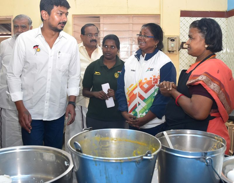 திண்டுக்கல் மேற்கு ரத வீதியில் உள்ள திண்டுக்கல் மாநகராட்சி தொடக்கப்பள்ளியில் முதலமைச்சரின் காலை சிற்றுண்டி வழங்கும் திட்டத்தின் செயல்பாடுகளை அமைச்சர் உதயநிதி ஸ்டாலின் ஆய்வு மேற்கொண்டார். அப்போது பள்ளி குழந்தைகள் பாடத்திட்டத்தில் உள்ள பாடலை பாடினர். பள்ளியில் அமைச்சர் குழந்தைகளுக்கு காலை உணவு பரிமாறி, உணவின் தரம் குறித்து கேட்டறிந்தார். பள்ளி வளாகம் துாய்மையாக பராமரிக்கப்படுகிறதா என்பதை பார்வையிட்டு, சுகாதார வளாகத்தையும் பார்வையிட்டார்.