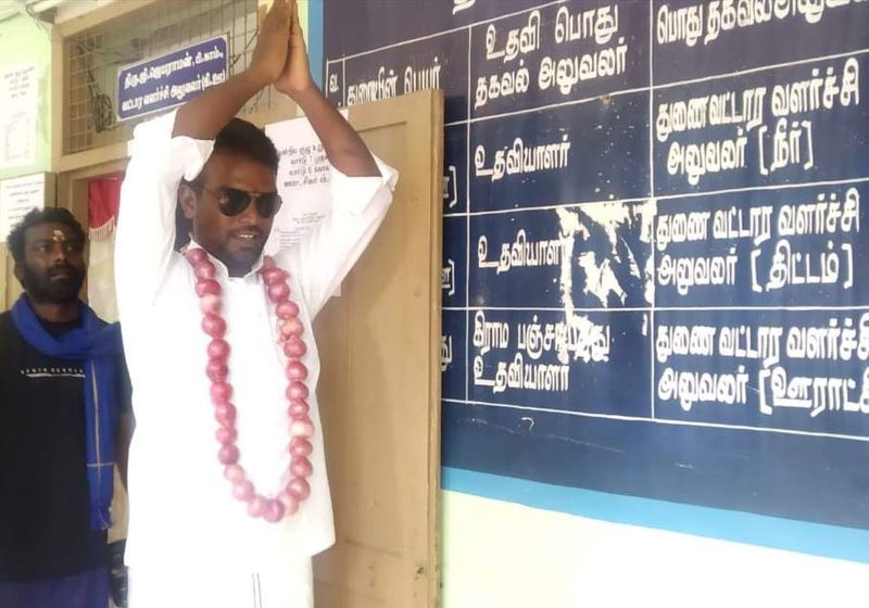 அதற்காக மதுரை கிழக்கு ஒன்றிய ஊராட்சி அலுவகத்திற்கு வேட்புமனு தாக்கல் செய்ய வருகை தந்த அவர் கழுத்தில் வெங்காய மாலை அணிந்திருந்தார். வெங்காய விலை தாறுமாறாக உயர்ந்து வரும் நிலையில் அதை கண்டிக்கும் விதமாக இவ்வாறு செயல்பட்டதாக அவர் கூறியுள்ளார்.