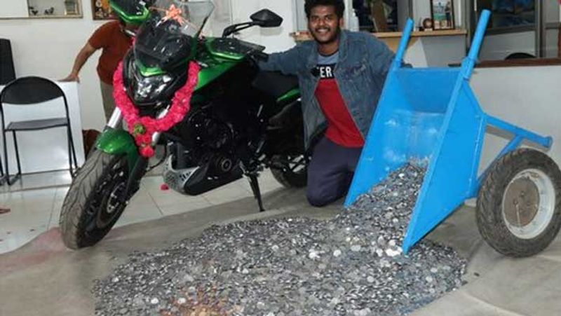 சேலம், அம்மாபேட்டை காந்தி மைதானம் பகுதியைச் சேர்ந்தவர் பூபதி. இவர் யூடியூப் சேனல் நடத்தி வருகிறார். இளம் வயது முதலே மிக உயர்ந்த விலையில் இருசக்கர வாகனம் வாங்க வேண்டும் என்ற ஆசை கொண்டிருந்தார். அதற்காக சிறுகச்சிறுக உண்டியலில் ரூபாய் நாணயங்களை சேமிக்கத் தொடங்கினார். அதிலும், சேமிப்பின் முக்கியத்துவத்தை மக்கள் அறிய வேண்டும் நோக்கில் ரூ.2.60 லட்சத்தையும் ரூ.1 நாணயங்களாக சேகரித்தார்.