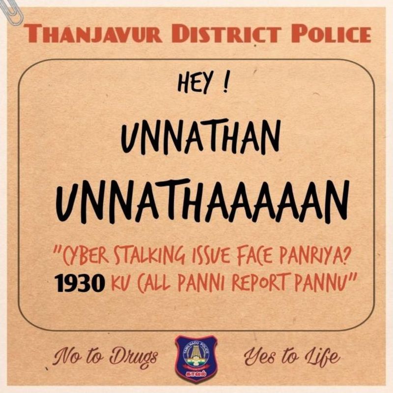 இதேபோல் மற்றொரு போஸ்டில், "ஹே ஒன்னத்தான்.. ஒன்னத்தான்.." சைபர் ஸ்டாக்கிங் பிரச்சினைகளை ஃபேஸ் பண்றியா.. 1930க்கு கால் பண்ணி ரிப்போர்ட் பண்ணு.." என்று இடம்பெற்றுள்ளது. பொதுமக்கள் பலரும் தஞ்சாவூர் காவல்துறையை பாராட்டி வருகிறார்கள்.