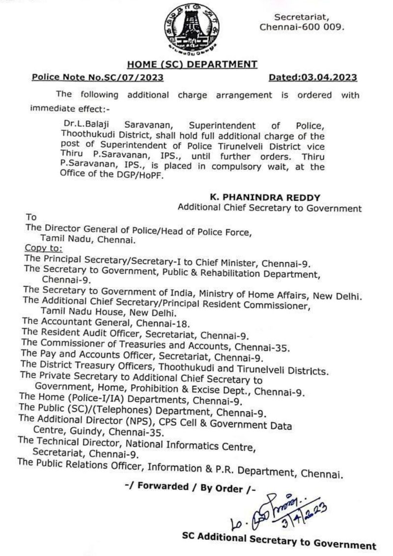 தூத்துக்குடி எஸ்.பி. பாலாஜி சரவணன், நெல்லை மாவட்ட எஸ்.பியாக கூடுதல் பொறுப்பு வகிப்பார் என்று தமிழ்நாடு அரசு தெரிவித்துள்ளது. காவல் கண்காணிப்பாளர் சரவணன், 2001-ல் டிஎஸ்பியாக தேர்வு பெற்றவர். விருதுநகர், மதுரை உள்ளிட்ட பல்வேறு இடங்களில் டிஎஸ்பியாக பணியாற்றியுள்ளார். மேலும் இவர் 2009 ஆம் ஆண்டு ஏடிஎஸ்பியாக பதவி உயர்வு பெற்று தருமபுரி, சேலம் பகுதிகளில் பணிபுரிந்தார்.