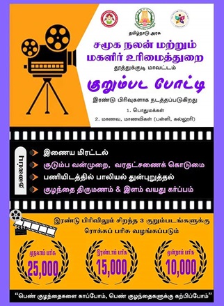 கலை ஆர்வலர்களுக்கும், சமூக சிந்தனையாளர்களுக்கும் ஒரு உற்சாகமான செய்தியுடன் காத்திருக்கிறது! சமூக நலன் மற்றும் மகளிர் உரிமைத் துறை, குறும்படங்களின் மூலம் சமூக அவலங்களை வெளிச்சம் போட்டுக் காட்டும் ஒரு அற்புதமான வாய்ப்பை உருவாக்கியுள்ளது. இணைய மிரட்டல், குடும்ப வன்முறை, வரதட்சணைக் கொடுமை, பணியிடத்தில் பாலியல் துன்புறுத்தல், குழந்தை திருமணம், இளம் வயது கர்ப்பம் போன்ற முக்கியமான பிரச்சினைகளை மையமாக வைத்து குறும்படப் போட்டி ஒன்றை அறிவித்துள்ளது.