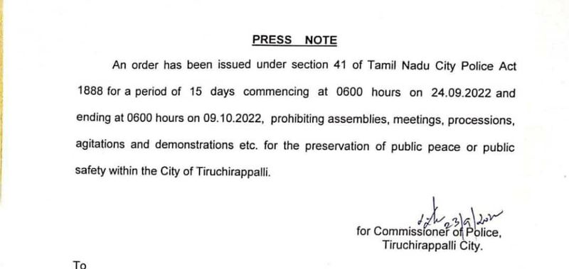 திருச்சி மாநகரில் இன்று முதல் வரும் அக்டோபர் மாதம் 9 ம் தேதி வரை, ஊர்வலம், பொதுக்கூட்டம் நடத்த தடை அதிரடியாக தடை விதிக்கப்பட்டுள்ளது.