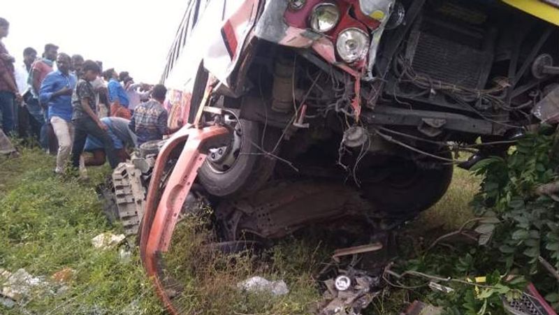 காரை முத்தமிழ்செல்வன் ஓட்டினார். மதியம் 12 மணி அளவில் கள்ளக்குறிச்சி மாவட்டம் உளுந்தூர்பேட்டையை அடுத்த வண்டிப்பாளையம் மழை மாரியம்மன் கோயில் எதிரே சென்றபோது, திடீரென கார் டயர் வெடித்து சாலையின் நடுவே இருந்த தடுப்பு கட்டையில் மோதி மற்றொரு சாலையில் சென்று கவிழ்ந்தது. அப்போது அந்த வழியாக விழுப்புரம் சென்றுகொண்டிருந்த தனியார் பேருந்து கண்ணிமைக்கும் நேரத்தில் கார் மீது மோதியது. இதில் பேருந்தில் அடிப்பகுதியில் கார் சிக்கி அப்பளம் போல் நொறுங்கியது.