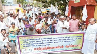 மத்திய அரசின் ஜிஎஸ்டி வரியில் மாற்றுத் திறனாளிகள் பயன்படுத்தும் அனைத்து வகை பொருள்களுக்கும் 18 சதவீத வரி விதிக்கப்படுவதால் அதனை எதிர்த்து அனைத்து வகை மாற்றுத் திறனாளிகள் மற்றும் பாதுகாப்போர் உரிமைக்கான சங்கத்தினர் செங்கல்பட்டில் ஆர்ப்பாட்டத்தில் ஈடுபட்டனர்.