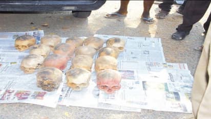 பெரம்பலூர் மந்திரவாதியின் வீட்டில் இருந்து கைப்பற்றப்பட்ட 20 மண்டை ஓடுகள், எலும்பு துண்டுகள், சாமி சிலைகள், வசிய மை டப்பாக்கள் உள்ளிட்ட பொருட்களை காவலாளர்கள் நீதிமன்றத்தில் ஒப்படைத்தனர்.